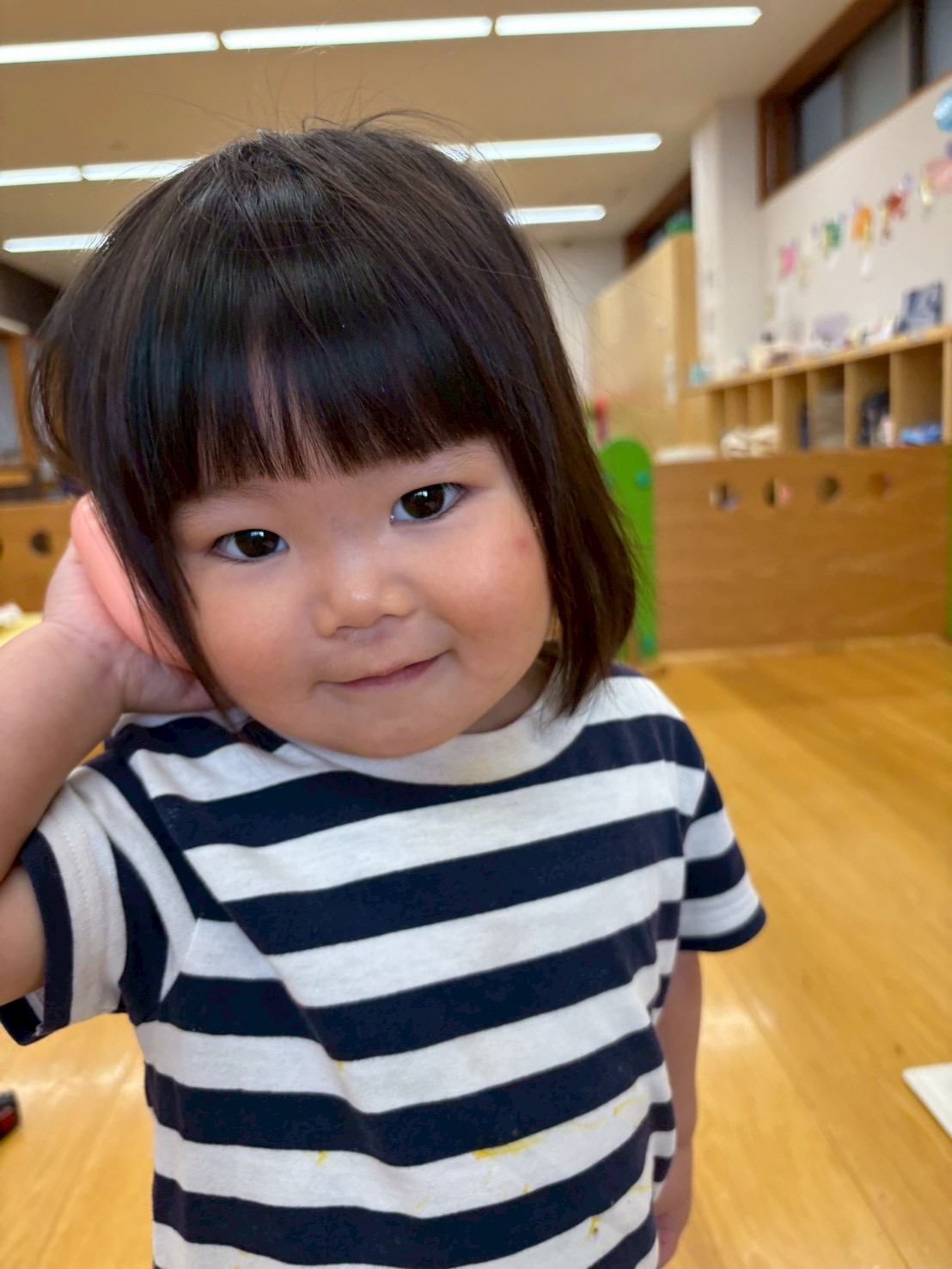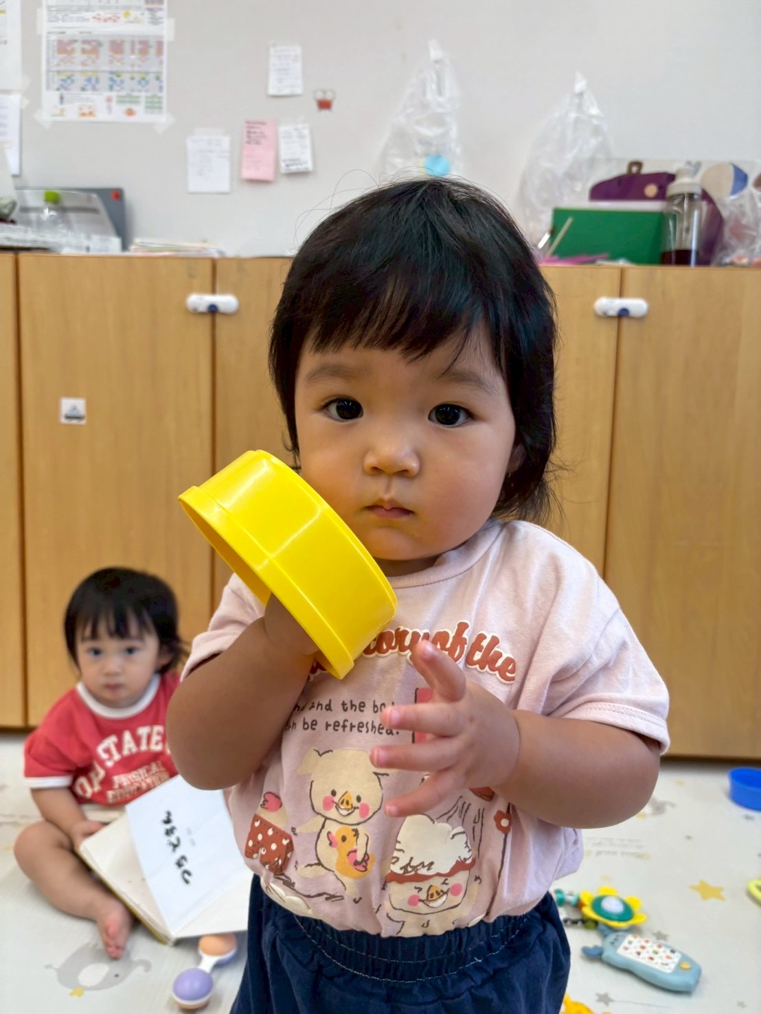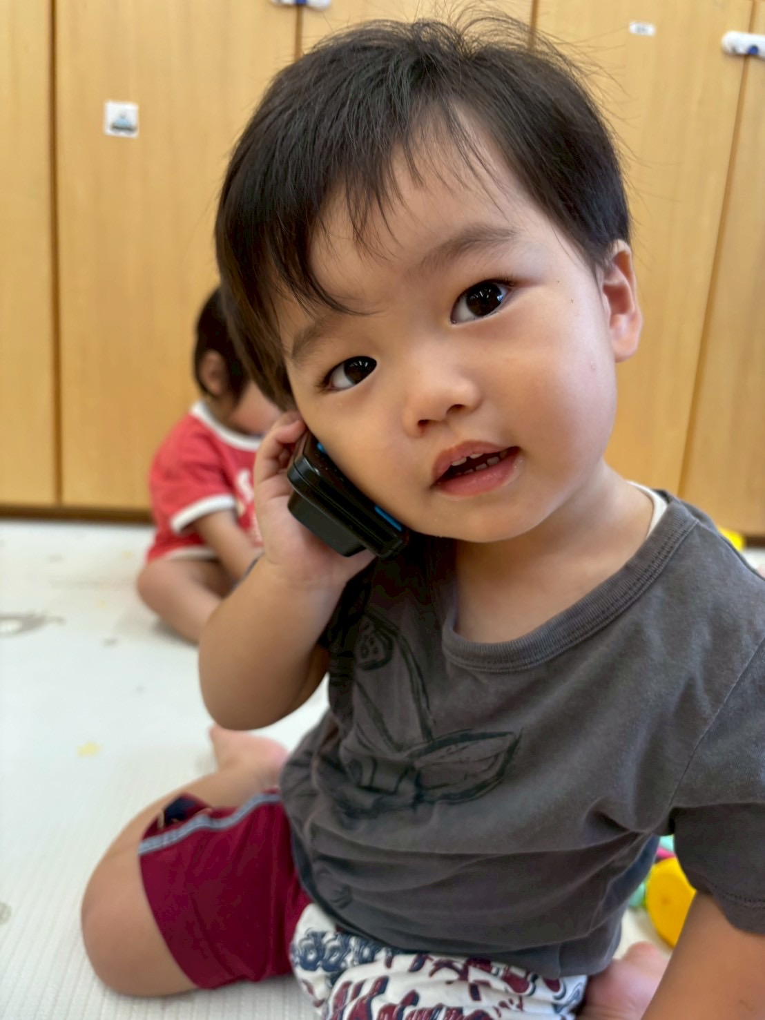 2025.09.22 もしもし📱🍑 いつもお電話で忙しそうなもも組のお友達 パパやママにお電話中なのか、、、 はたまた お仕事の連絡なのか、、、 「うん うん」 「あぁ〜」 「はい」 本当に電話しているかのようにお話をしています😳