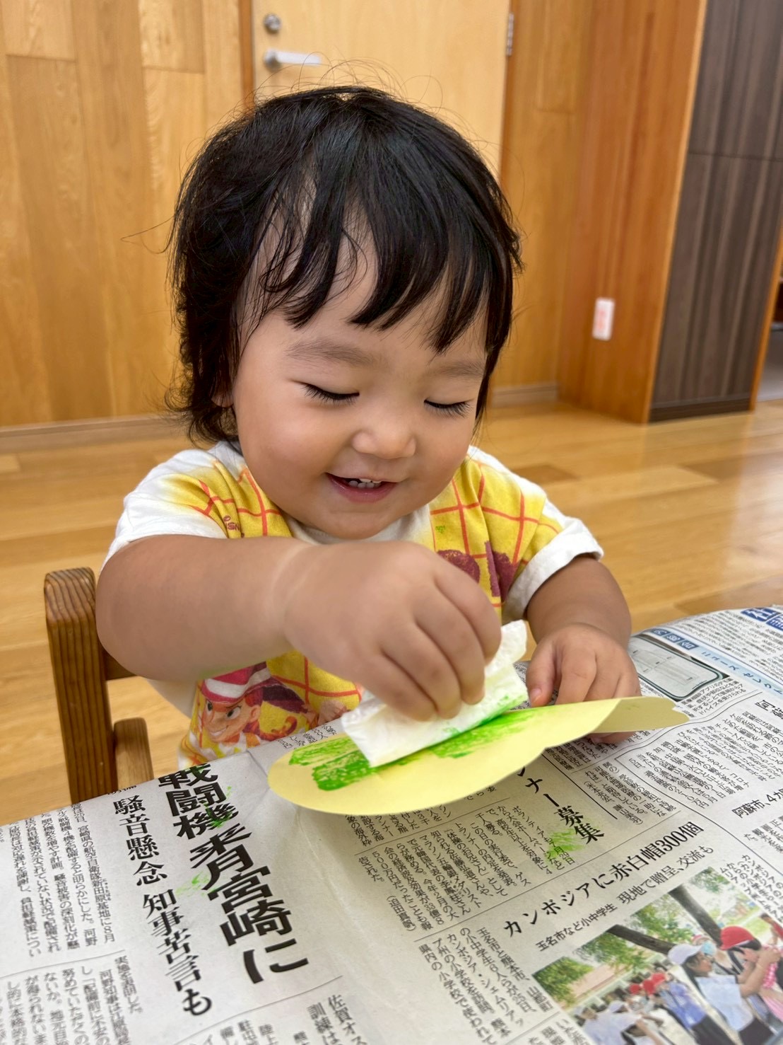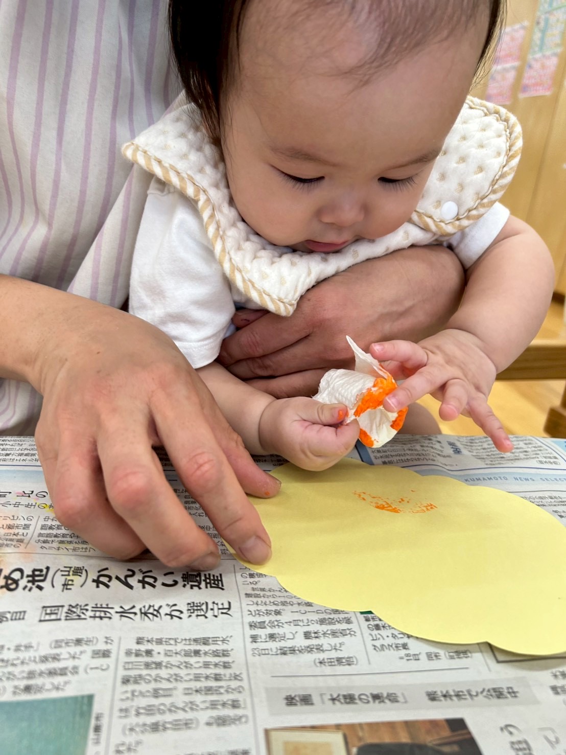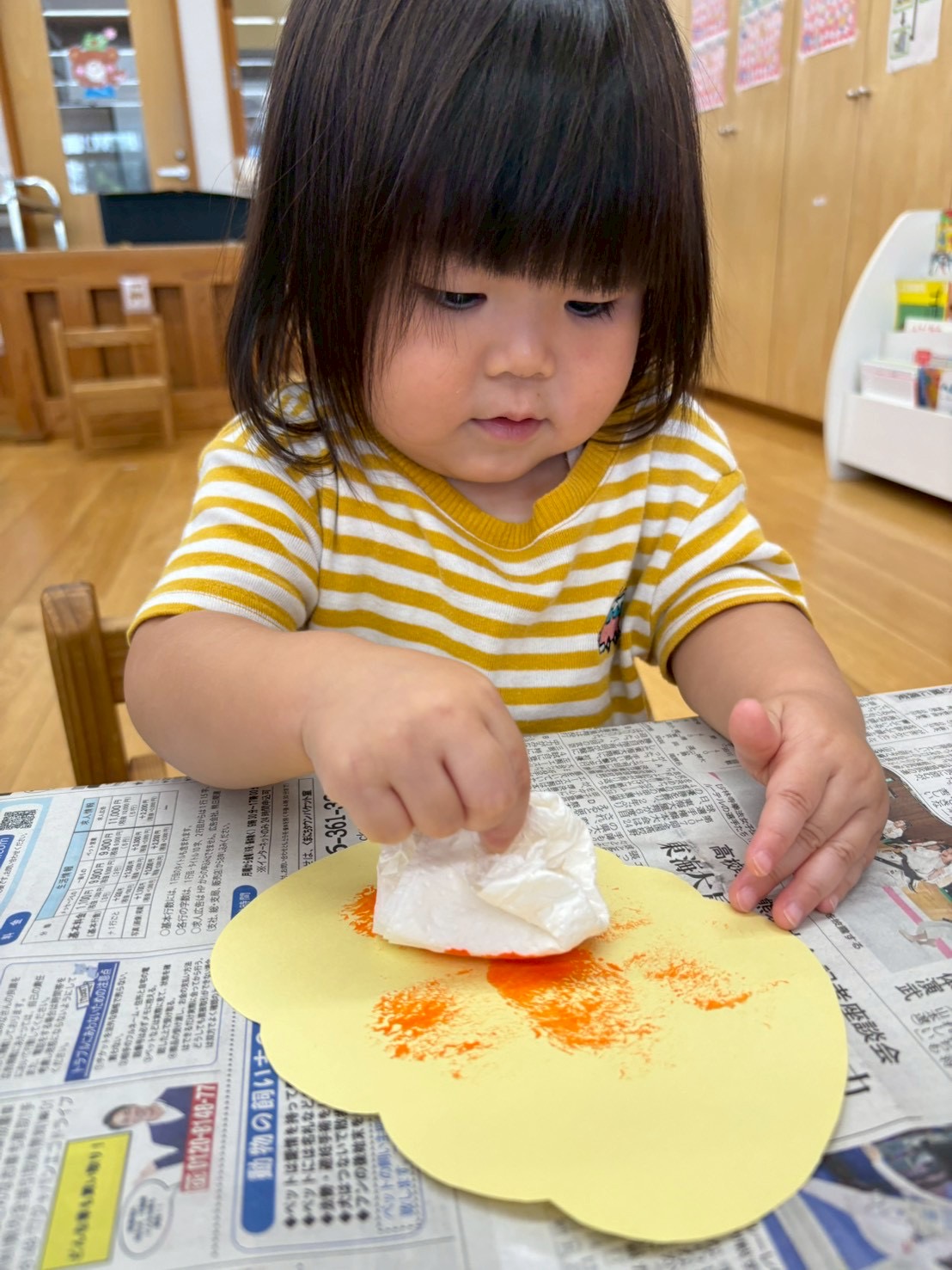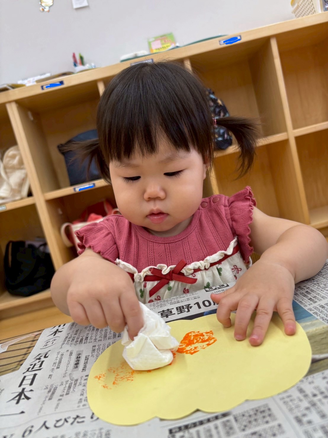 2025.10.15 ペタペタ🍑 10月31日はハロウィン🎃 この日はハロウィンにちなんだ製作をしました。 みんなでペタペタ🎨 「これはなんだろう」 私はオレンジを選んだよ。 みどり色も綺麗だね どんな作品に仕上がるのでしょうか。 みなさまお楽しみに。