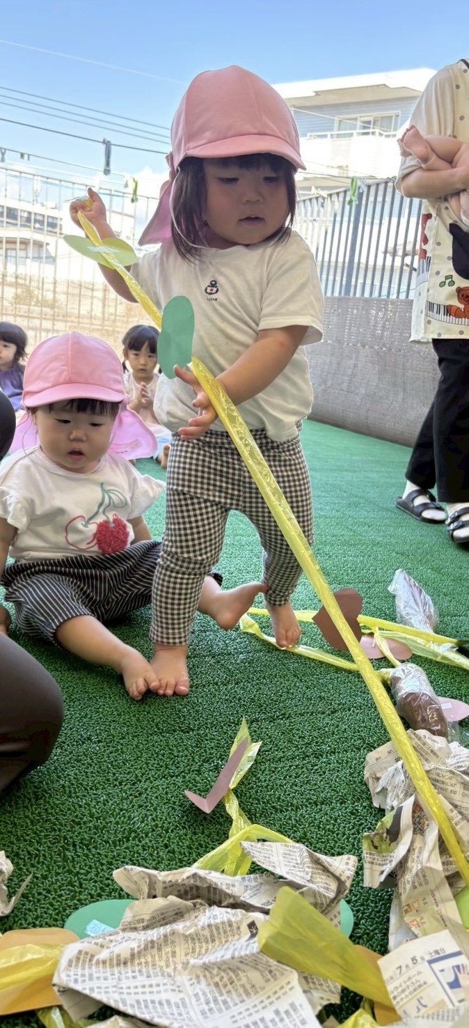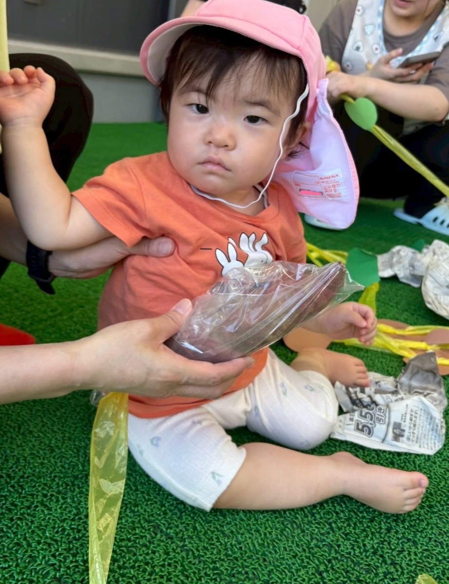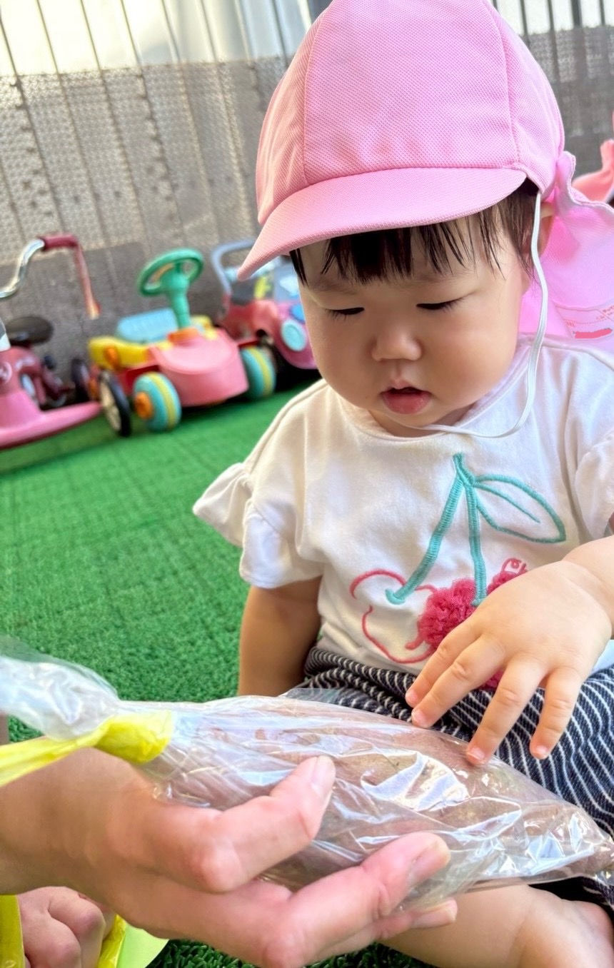 0歳児のお友だちは、はじめてお芋を見たのかもしれませんね。ちょっと困り顔。