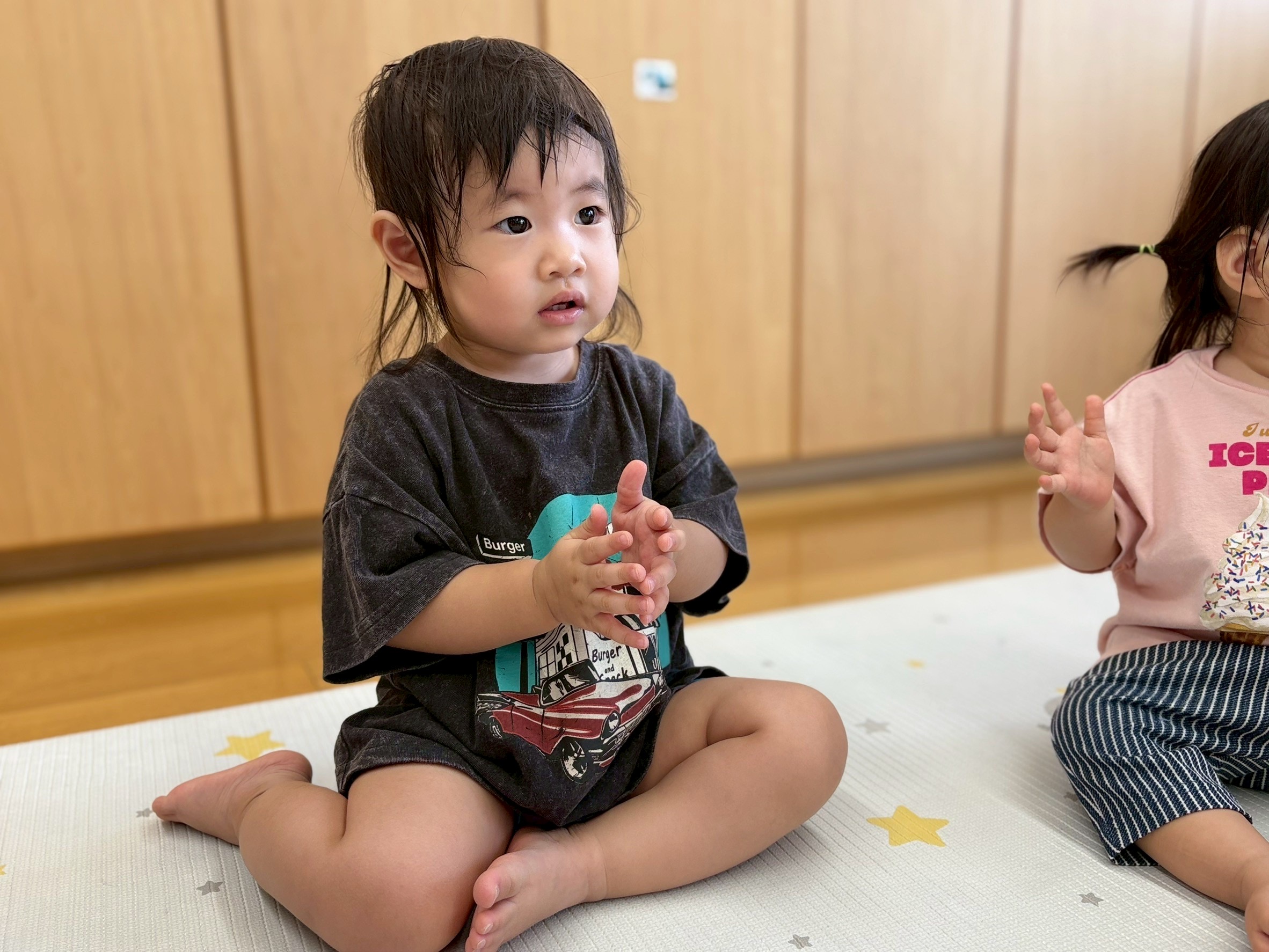 先生の真似をして手をたたいたり、音楽に合わせてたたきます。
