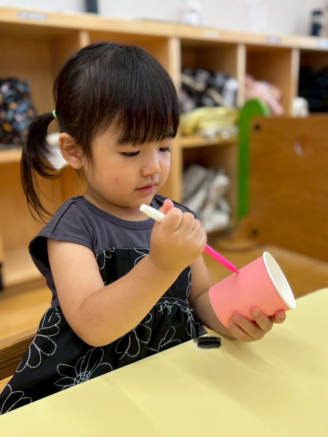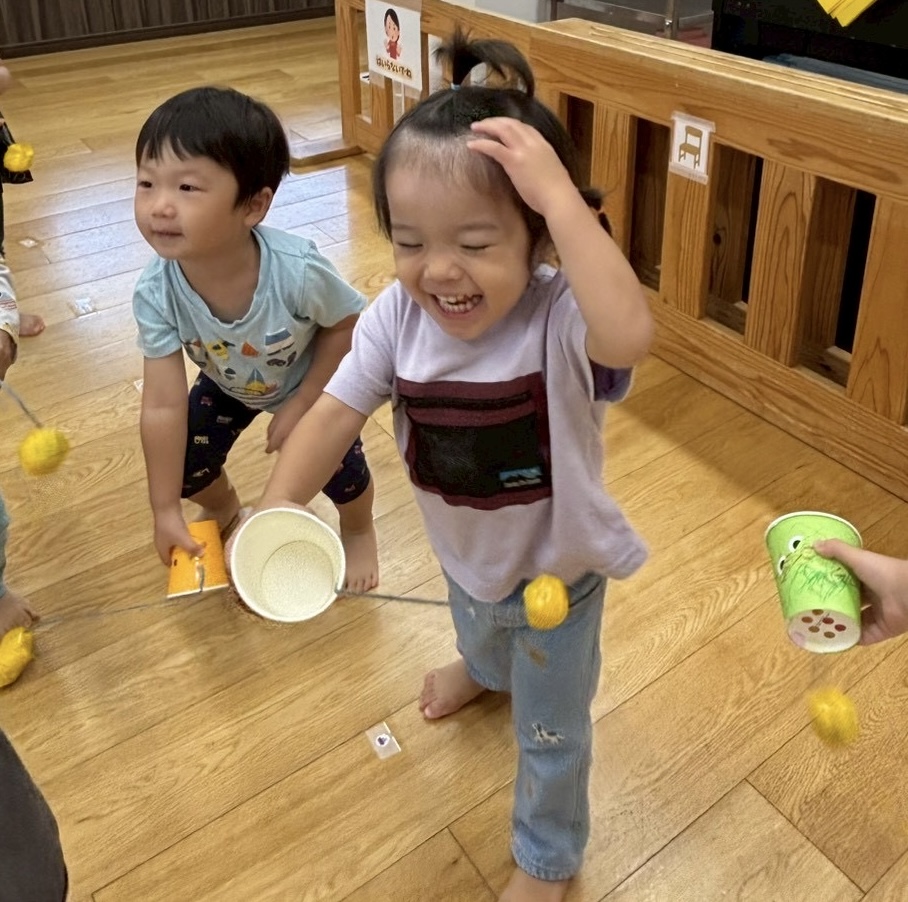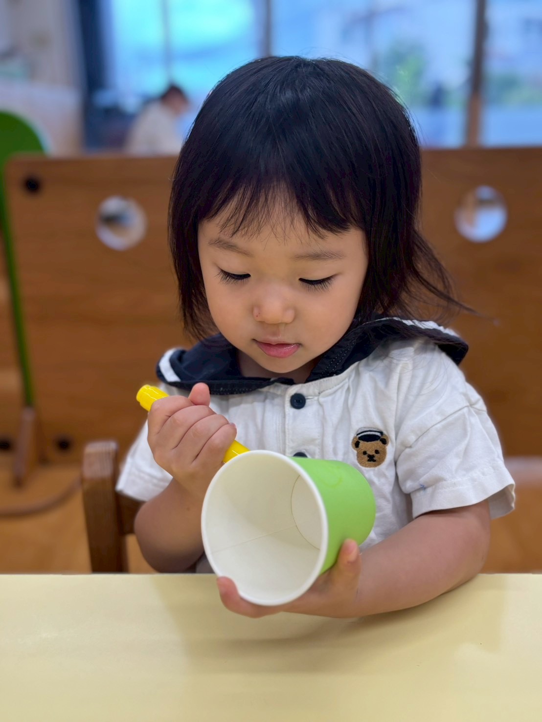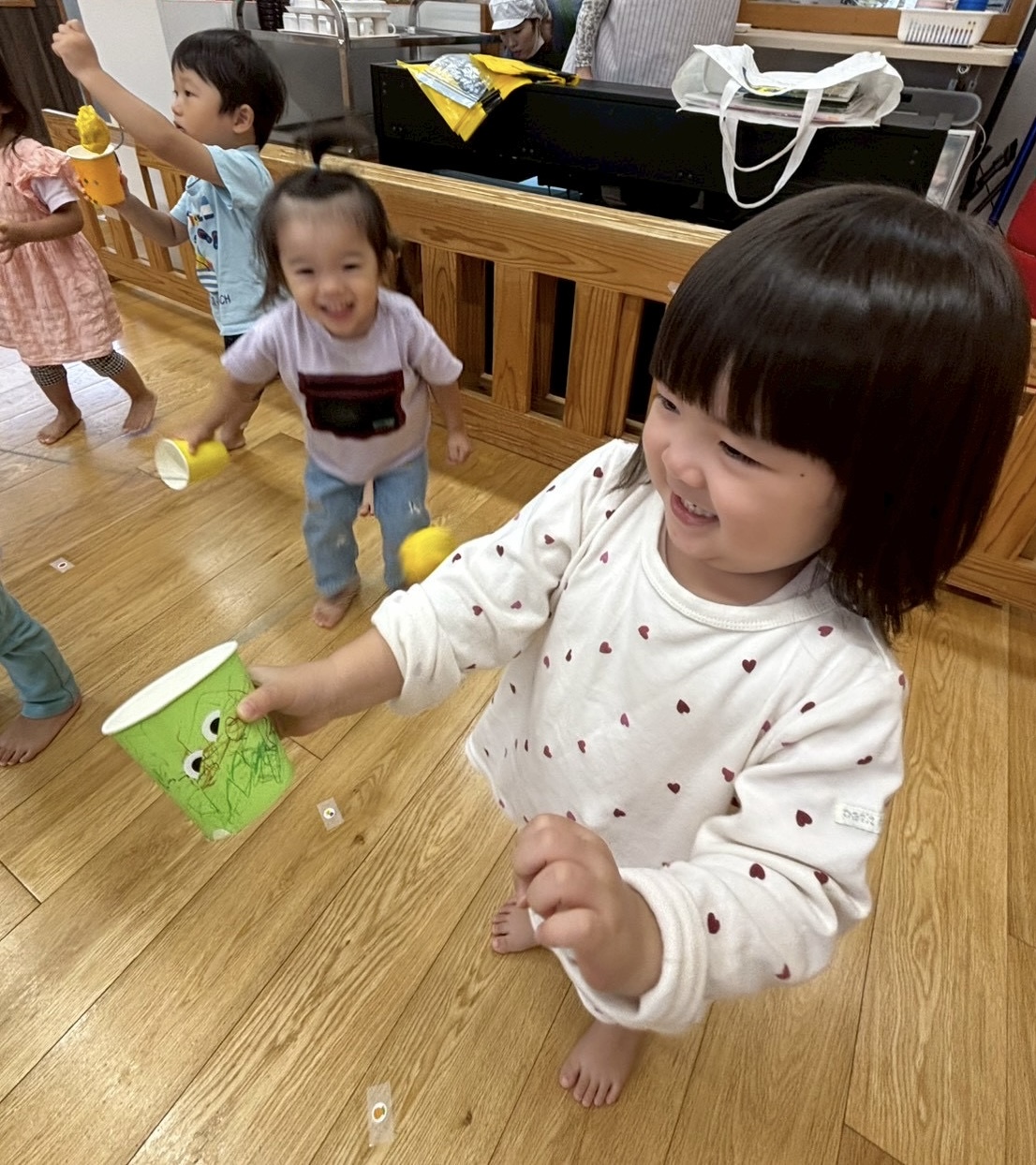 2025.10.20 けん玉大会🥚🌸 今日はけん玉作りをしました😊🎵 紙コップのまわりを自分の好きなようにお絵描きをしたり、シールを貼ります🎀 絵を描くときの集中力はすごいです✨😆 出来上がった作品を持って みんなでけん玉大会を開催しました☆✨ あれ😅💦 自分の頭に当たっちゃった😂💦💦 入ったよー!🎵 すごいでしょー✨✨ 中々入らないけん玉に手で入れる技も見つけて みんな無事入れることができました😆 またしようね😊💓
