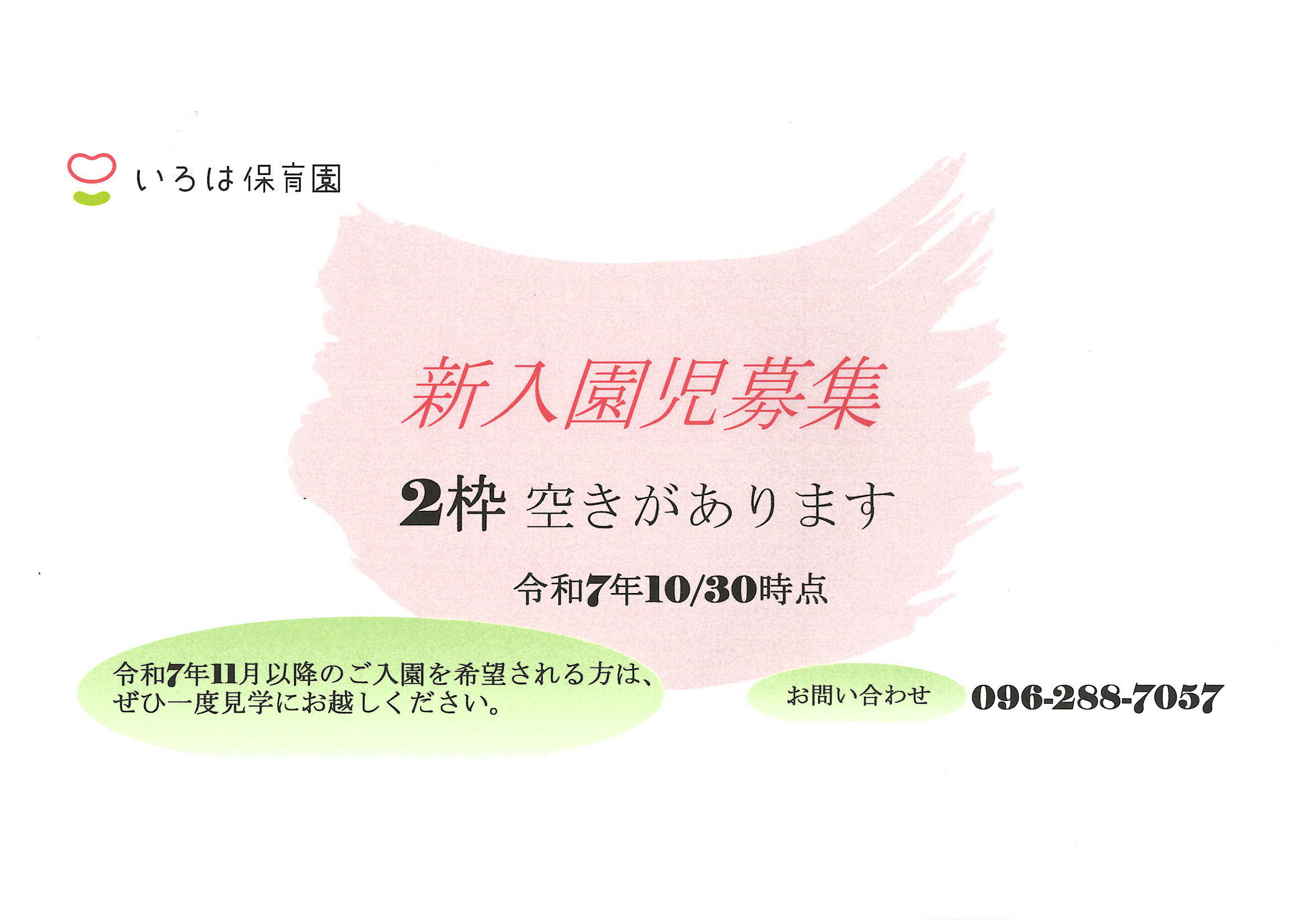 2025.10.31 11月からの新入園児募集(10.30 時点) 令和7年11月以降のご入園を希望される方は、ぜひ見学にお越しください。 また、来年度の空き枠も2枠になります。 まずはお電話でのご予約をお願いいたします。 担当:河野