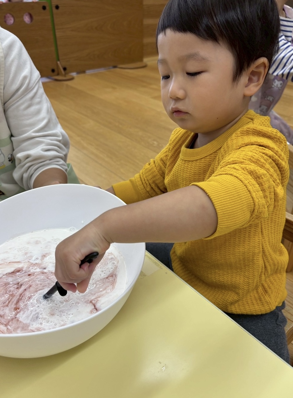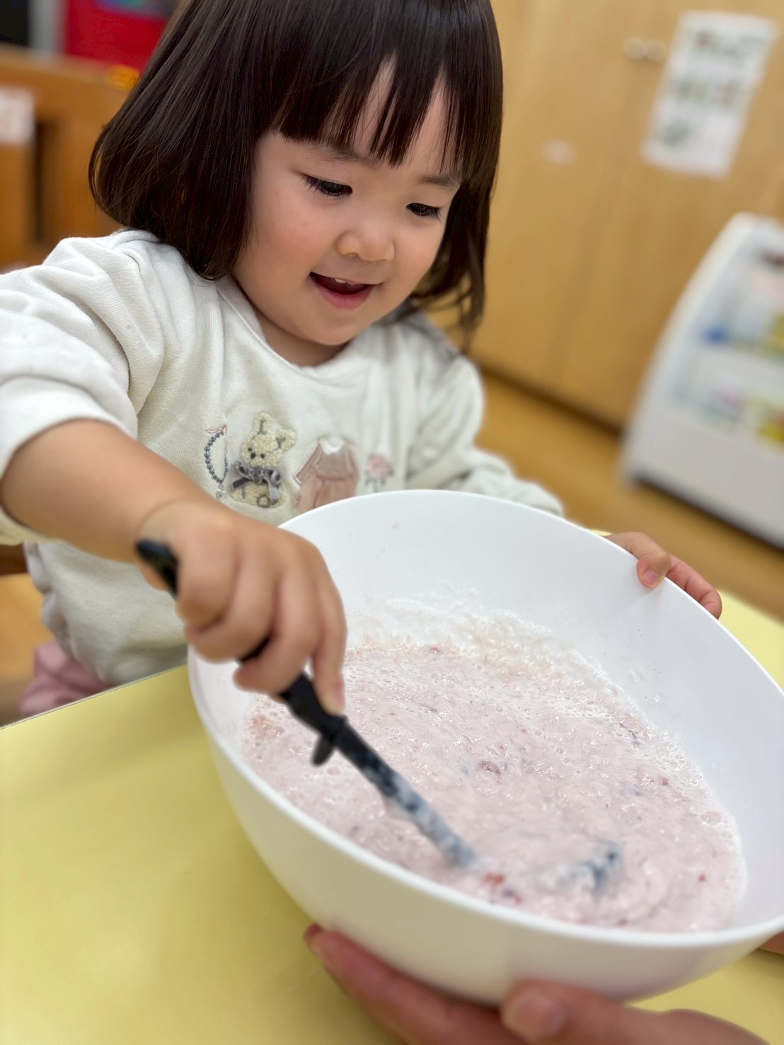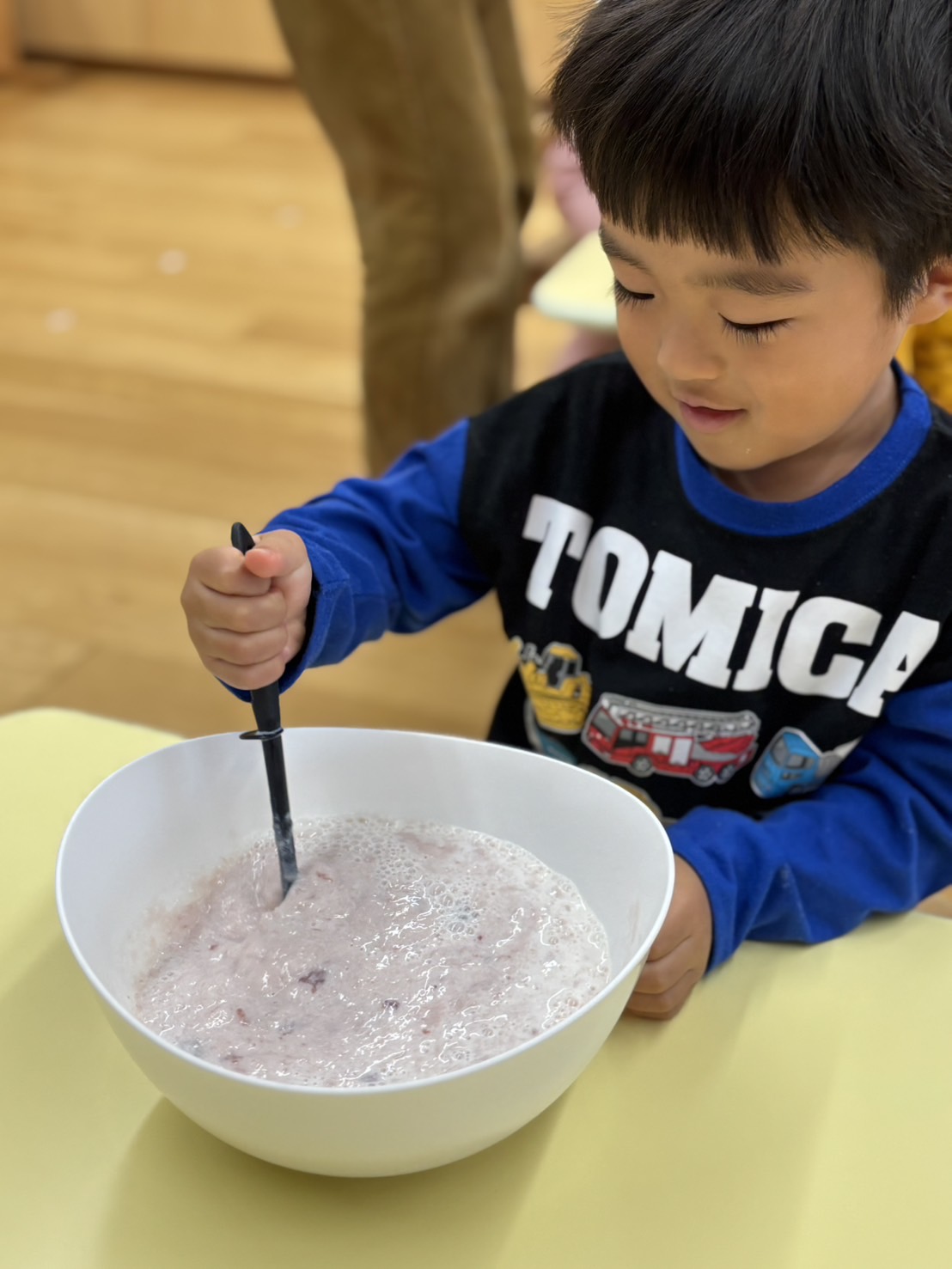フルーチェが牛乳と混ざる様子や固まっていく様子を楽しむことができました!