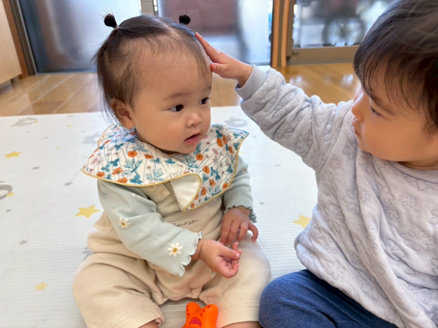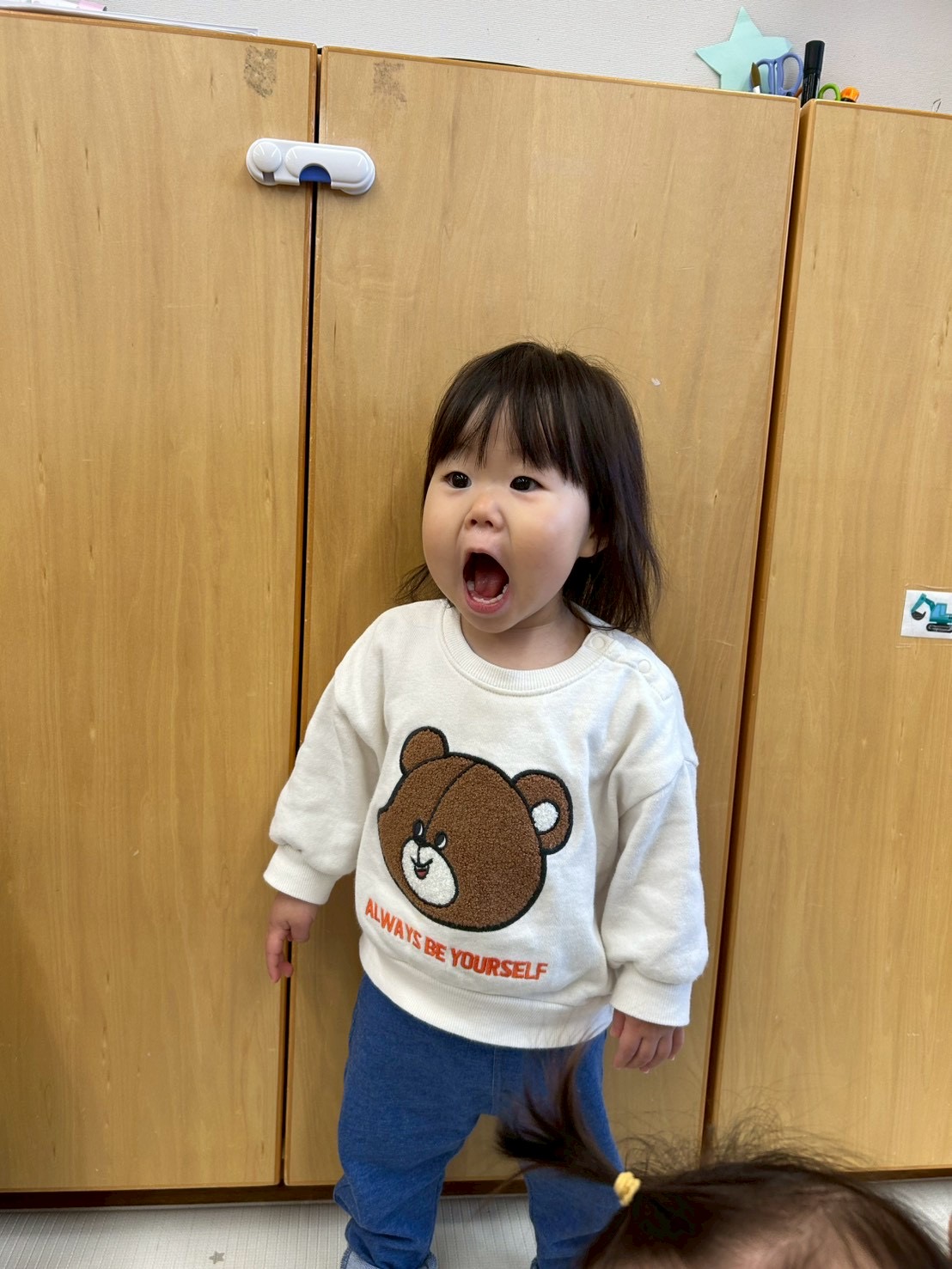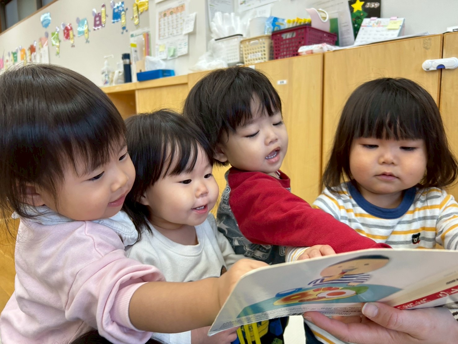 絵本に手を伸ばし、アムアムと食べる真似をするお友達です💕