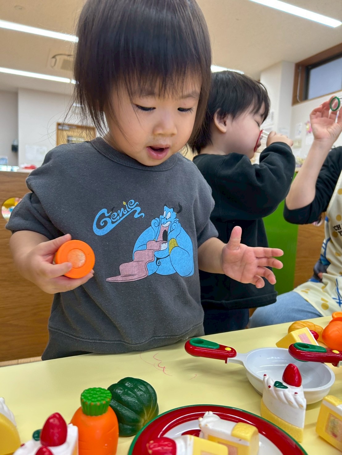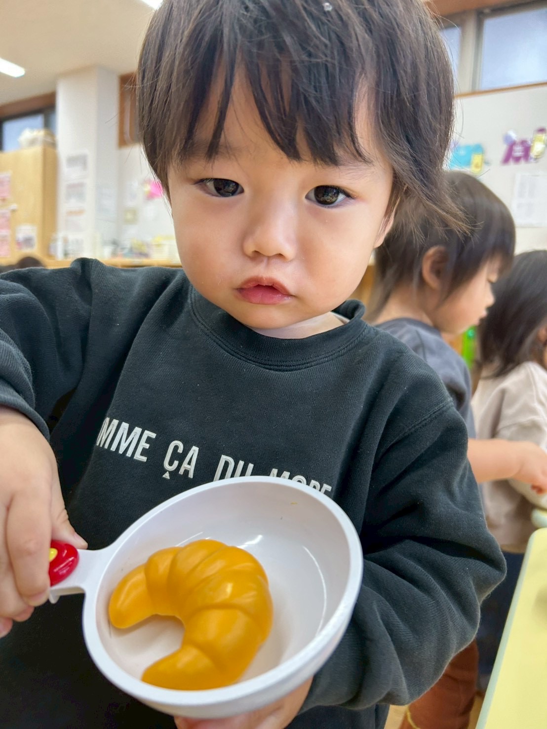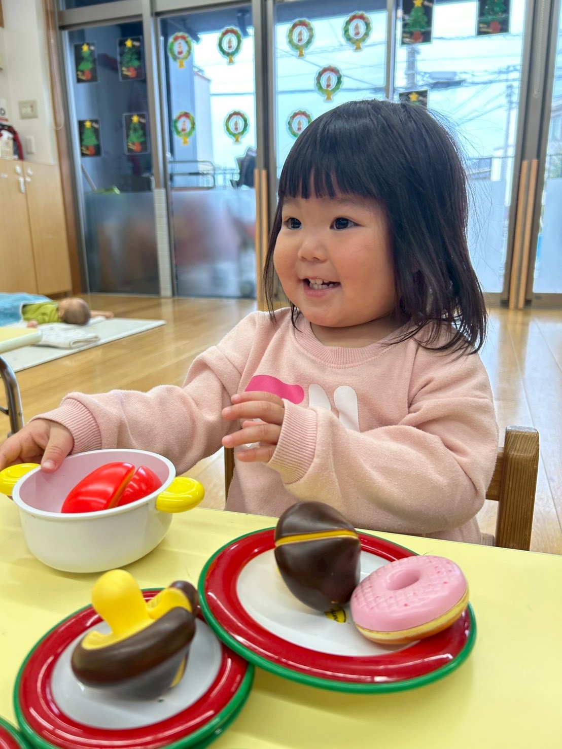 2025.12.08 おままごと🍳🍑 今日はおままごとをしました さぁ、今日は何を作ろうかな〜🥄 先生みてみて〜〜 パンができたよ!🥐 私はりんごのスープ作ってみたよー!🍎 お鍋やフライパンを使ってたくさんのお料理が出来上がりました🍳 お気に入りのおもちゃを見つけてニコニコです☺️ 両手でブロックを入れたり出したりを楽しむお友達も👀 橋のおもちゃを眼鏡に見立てるお友達も! 発想が可愛らしいですね❣️