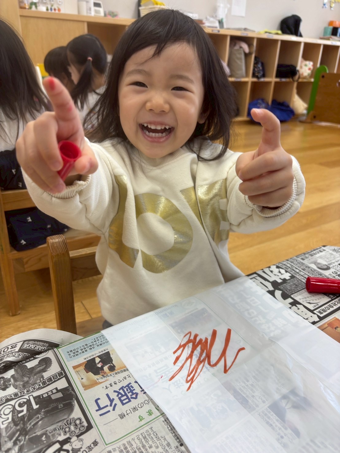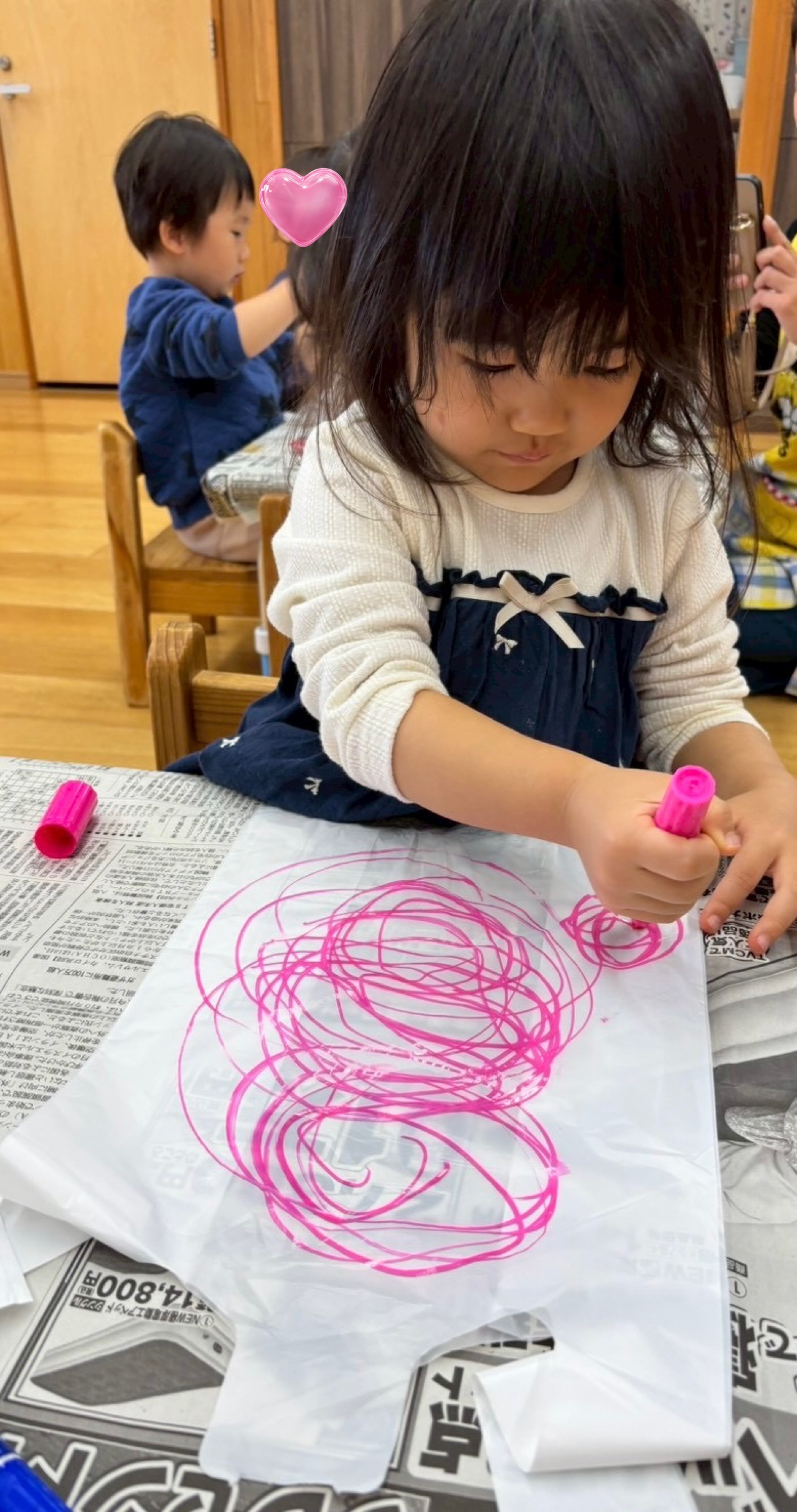描きたものに「スーパーマンだよ」「アンパンマンだよ」「こどもヒーローだよ」と言い名前をつけたり、丸が描けるようになったり、色の変化に気づいたりと子ども達の成長を感じることができました😌