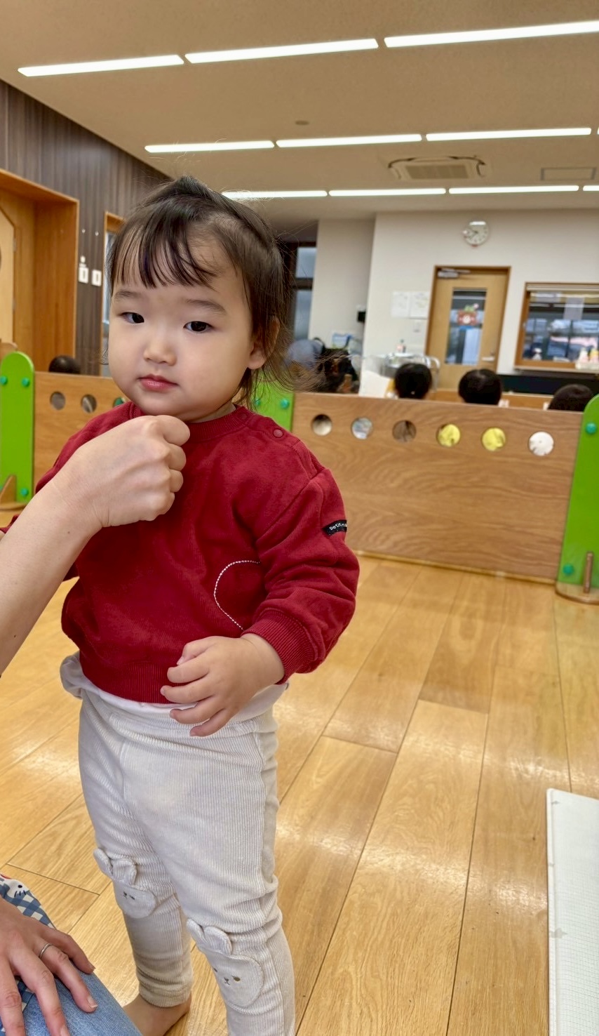 2026.01.18 『おなまえなんですか』🍑 インタビューごっこをしました。 まだ言葉にはできないこともあるけど、みんなの前に立ち先生の質問を聞いていました。 みんなに聞いて欲しい気持ちが伝わります。