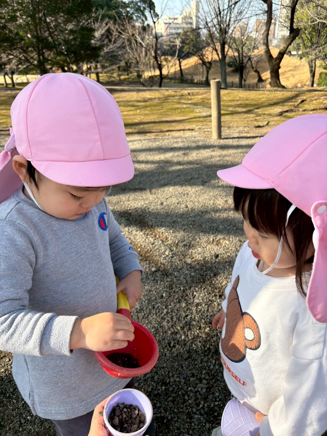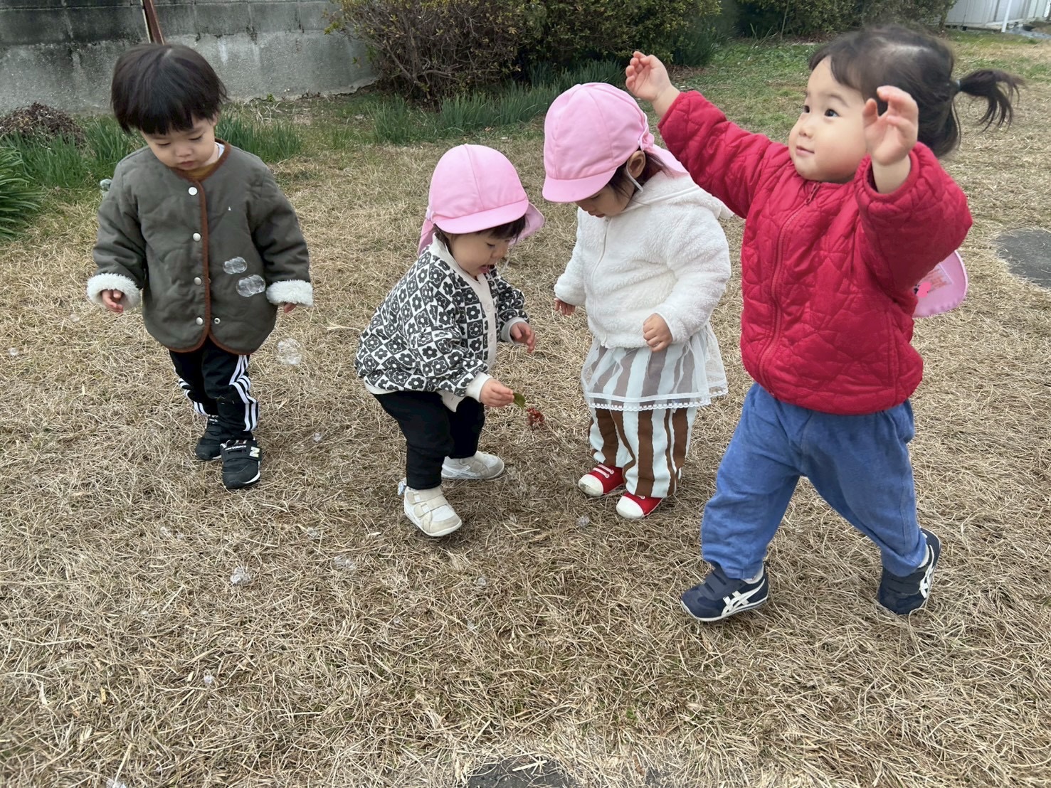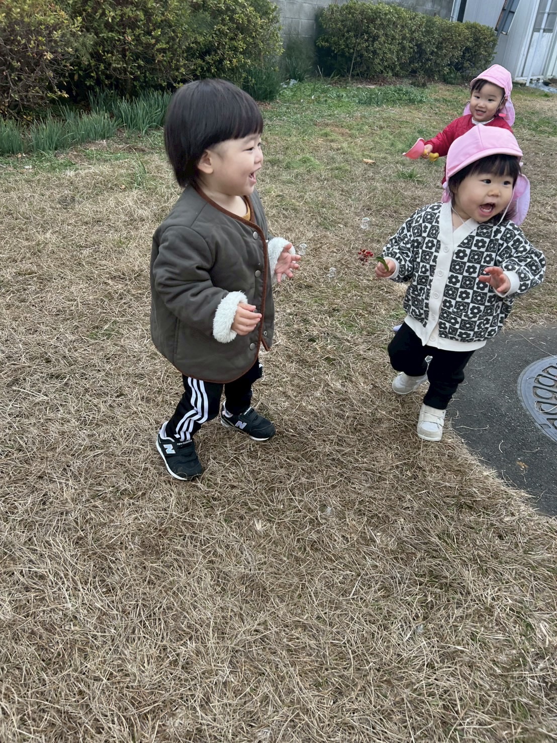 2026.01.23 シャボン玉飛んだ🍑 みんなシャボン玉を捕まえたくて元気に追いかけます。 うまく捕まえられたかな☺︎ みんな、何しているの? おともだちの遊びも気になるようです。 お外でも笑顔で元気いっぱいです。 石や砂の感触も楽しいね。 お外はとっても寒いですが、子どもたちはこの寒さも元気いっぱい楽しんでいました。