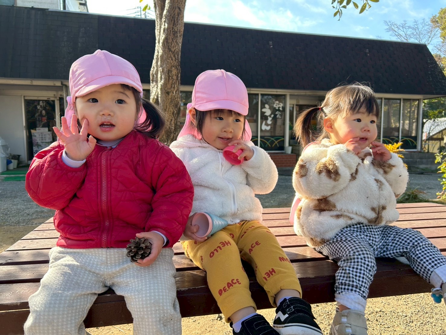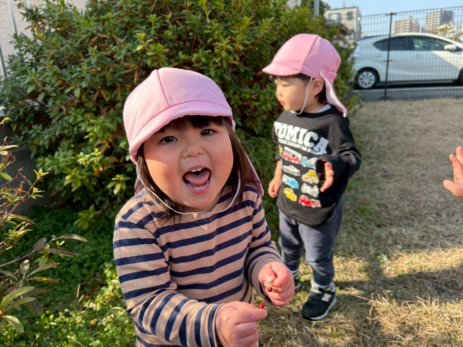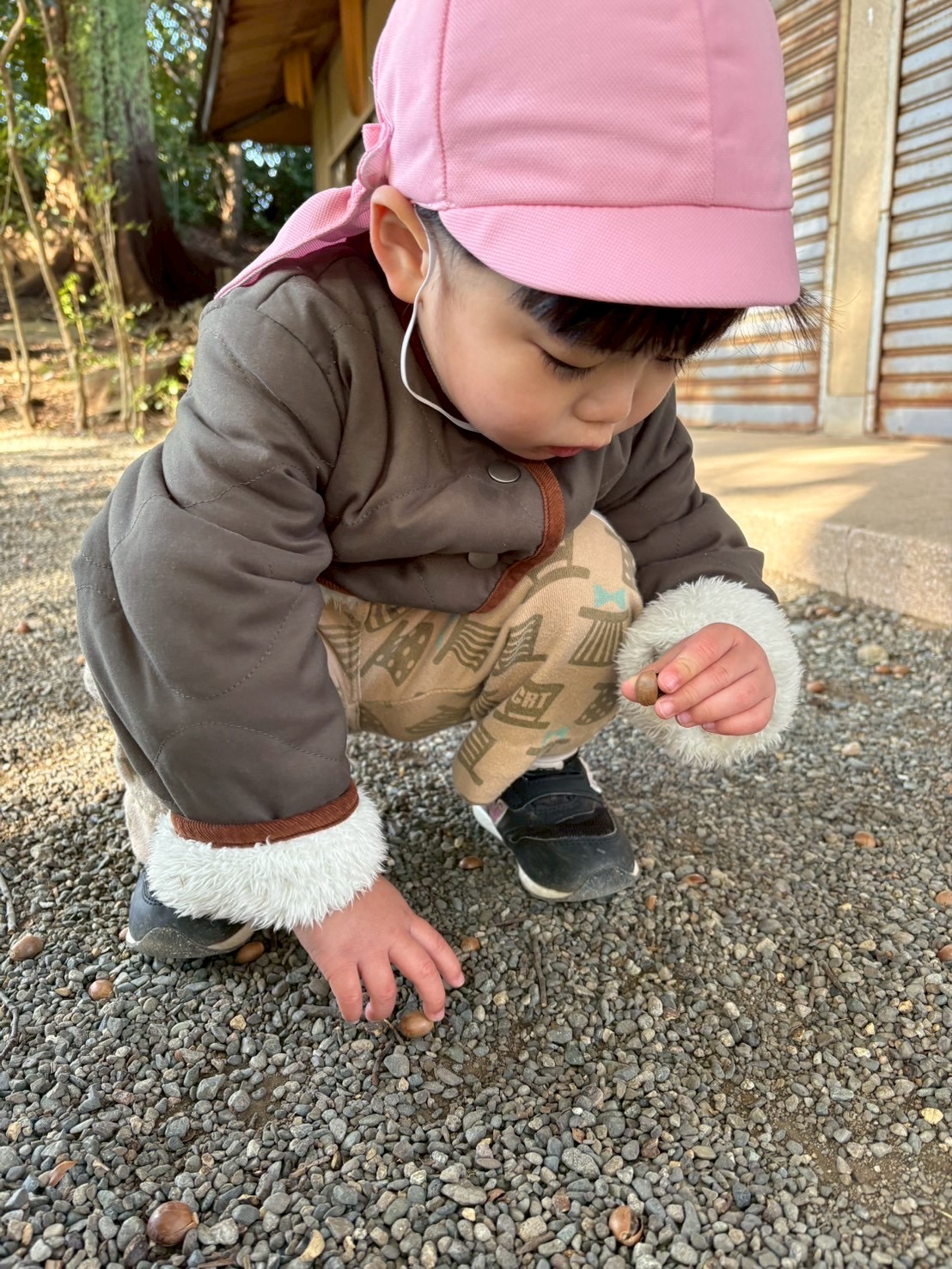 2026.01.31 そとあそび🍑 水前寺成就園では、ドングリをたくさん見つけました。 「あった、あったよ」 じーっと見つめて観察中。 だいすきなまちの広場でたくさん遊んだよ。 赤い実を見つけると、すぐに先生に報告してくれます。 お靴を上手に履けたね。 ほら、立てたよ。 私たちはちょっと休憩☺︎ 寒くても元気いっぱいのもも組さんです。