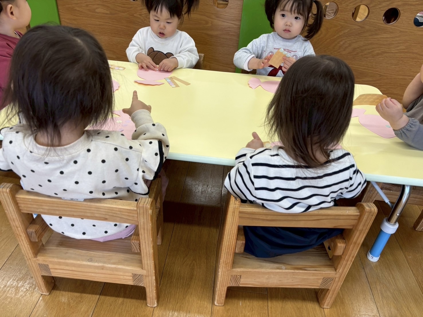 2026.02.18 ひな祭り製作🍑 来月は桃の節句がありますね🎎 もも組さんは、ひなあられとぼんぼりの製作をしました🎎 シールを台紙からはずして、一枚一枚丁寧に貼り付けていました。 好きな色の折り紙を選んで好きなところに貼り付けていました。指先をつかって集中して取り組んでいました。 出来上がりをお楽しみに🎎