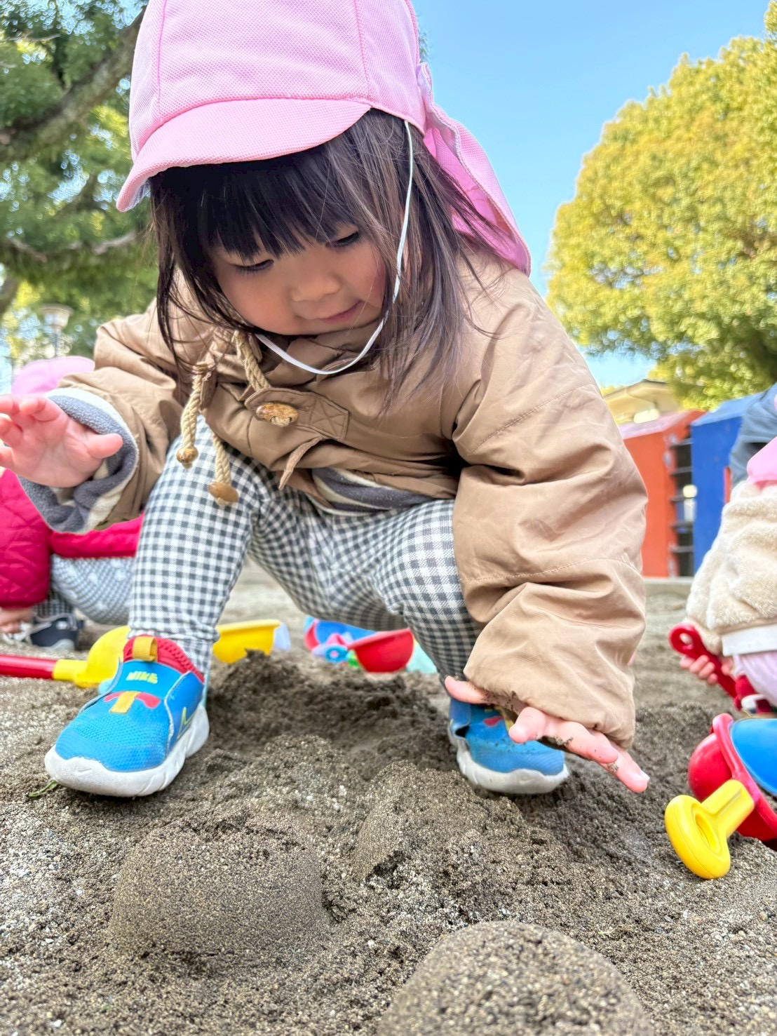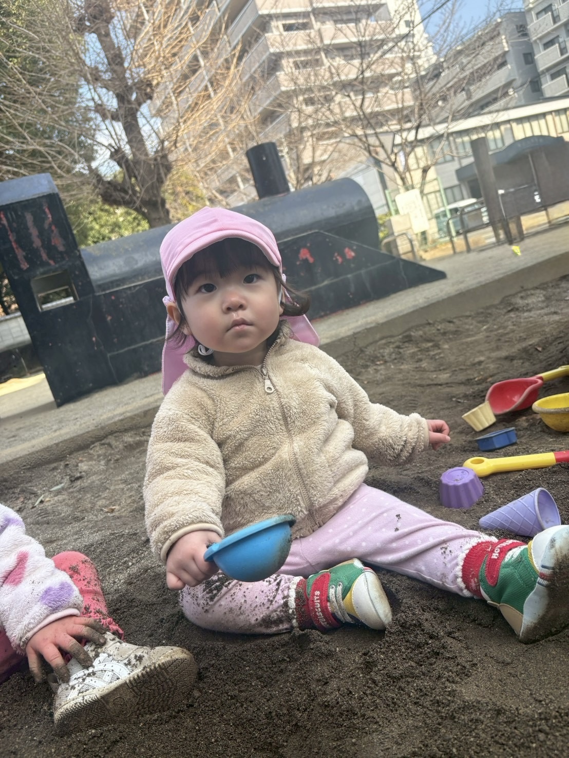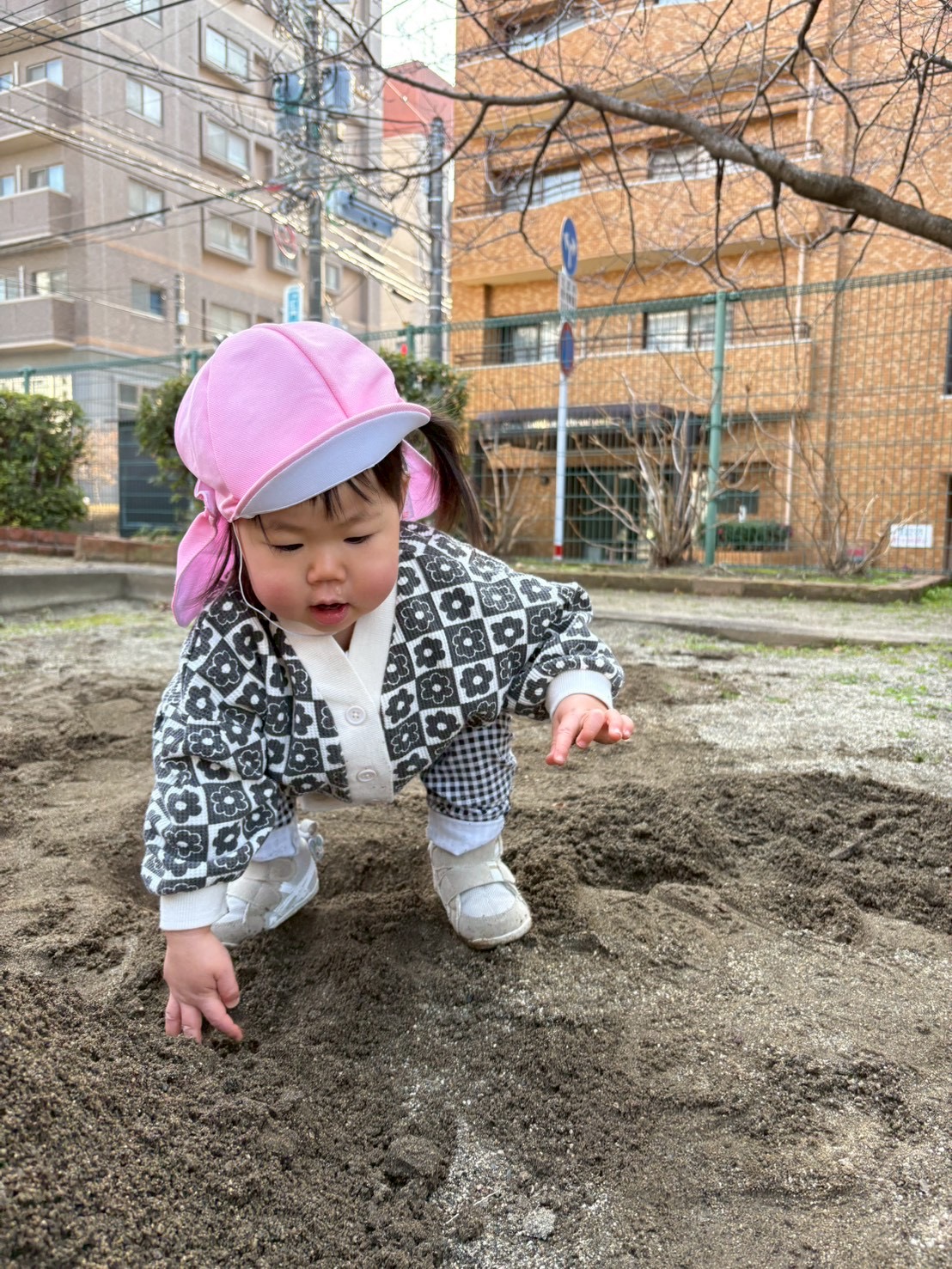 2026.02.19 砂遊び🍑 北水前寺公園にお散歩に行きました。 もも組さんはこの場所では初めてのお砂場遊びを楽しみました。 0歳児さんもスコップを使ってお砂をすくったり、触ってみたりと楽しみました。 砂を掴んだり、落としたり、形を作ったりと、手指を使い感触を楽しみながら夢中になって遊んでいました☺︎砂遊びは五感も刺激されていいことがたくさんありますね☺︎ パパ、ママ一緒に砂遊びしようね☺︎
