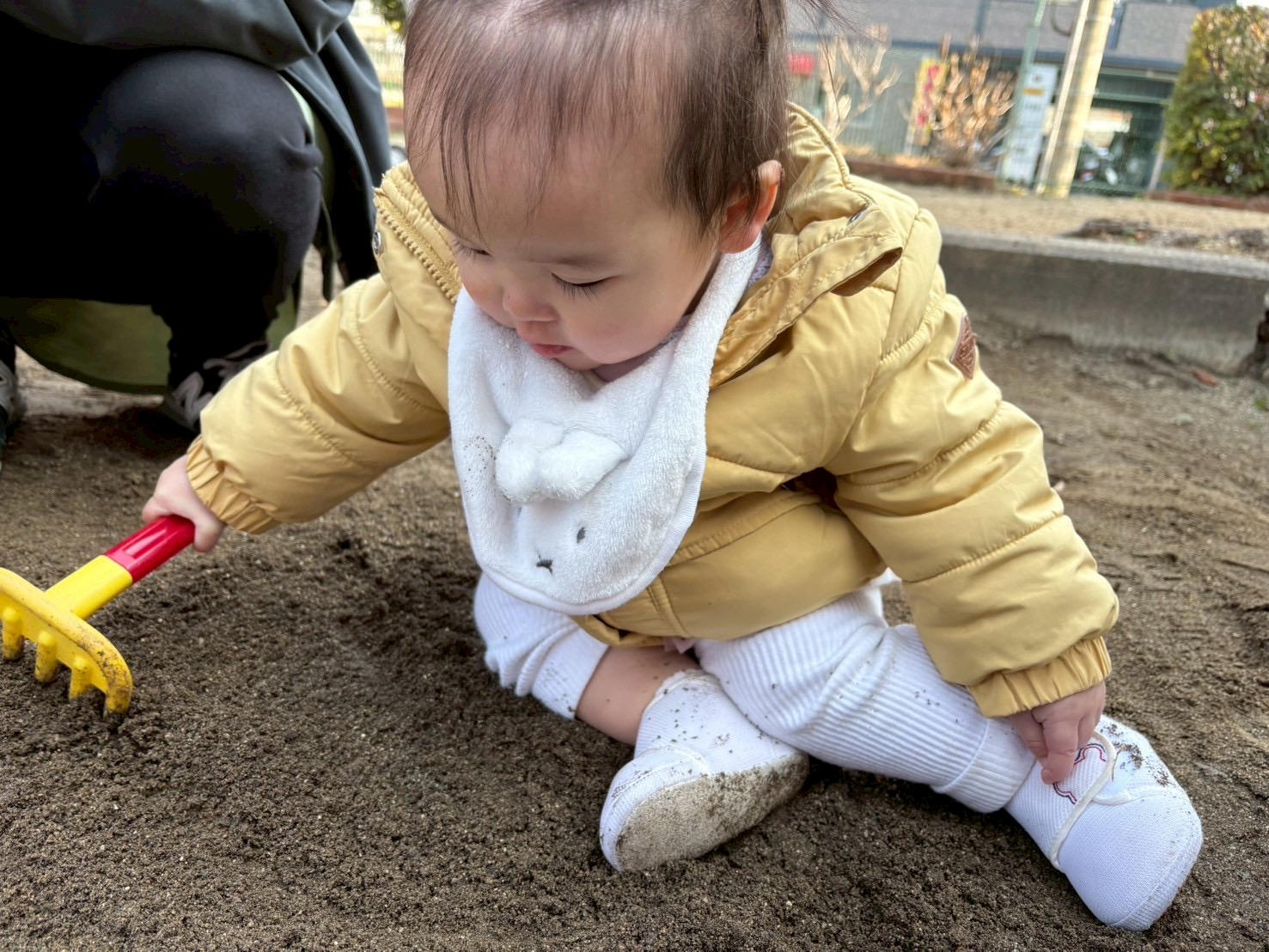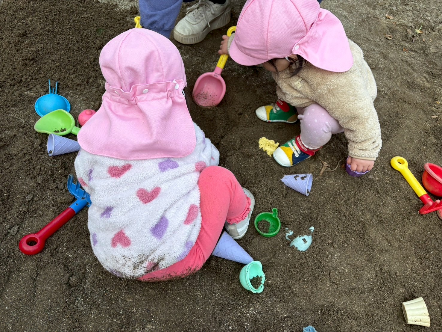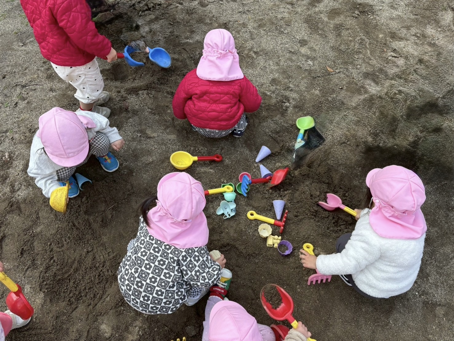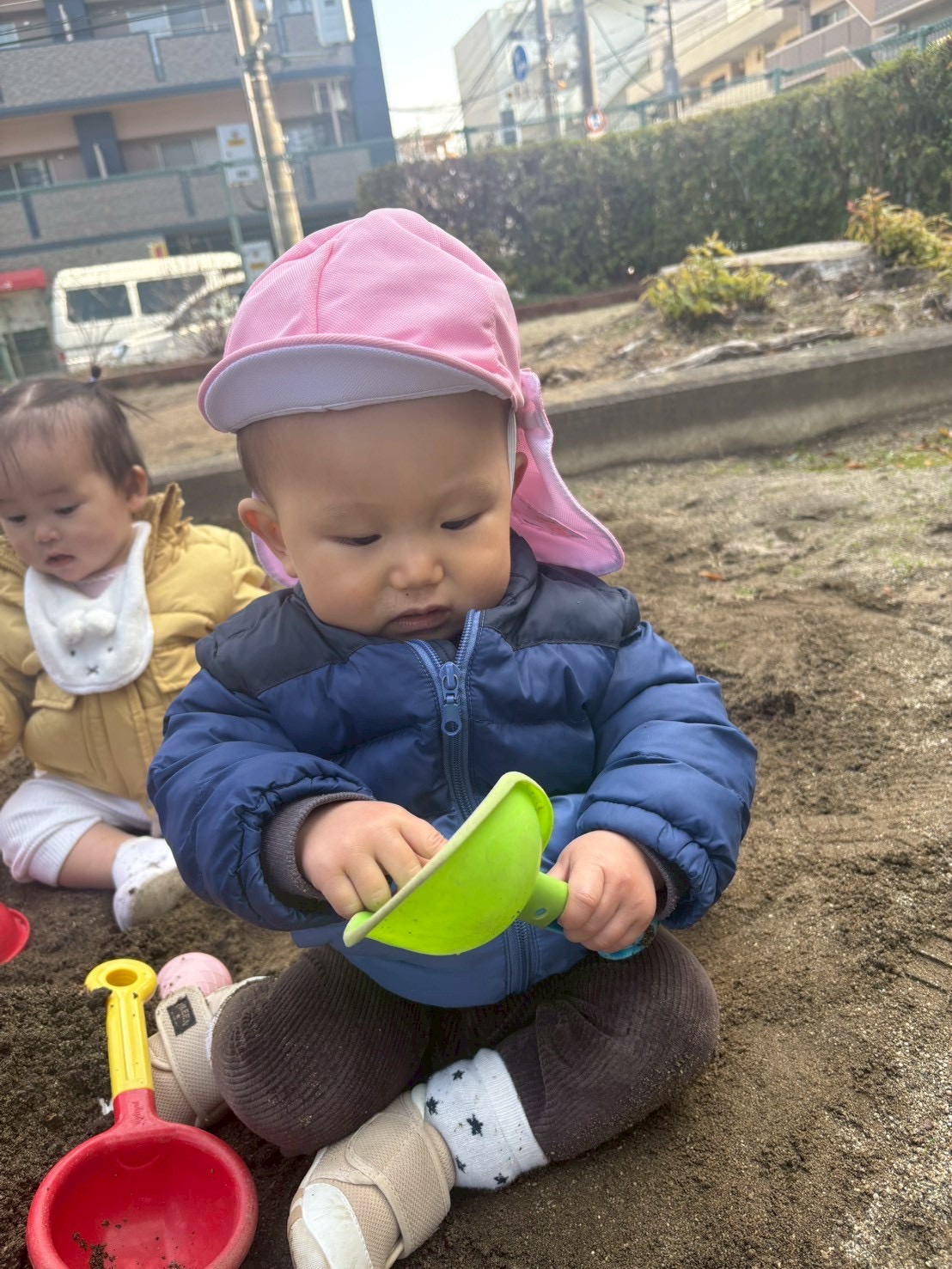 2026.02.19 砂遊び🍑 北水前寺公園にお散歩に行きました。 もも組さんはこの場所では初めてのお砂場遊びを楽しみました。 0歳児さんもスコップを使ってお砂をすくったり、触ってみたりと楽しみました。 砂を掴んだり、落としたり、形を作ったりと、手指を使い感触を楽しみながら夢中になって遊んでいました☺︎砂遊びは五感も刺激されていいことがたくさんありますね☺︎ パパ、ママ一緒に砂遊びしようね☺︎