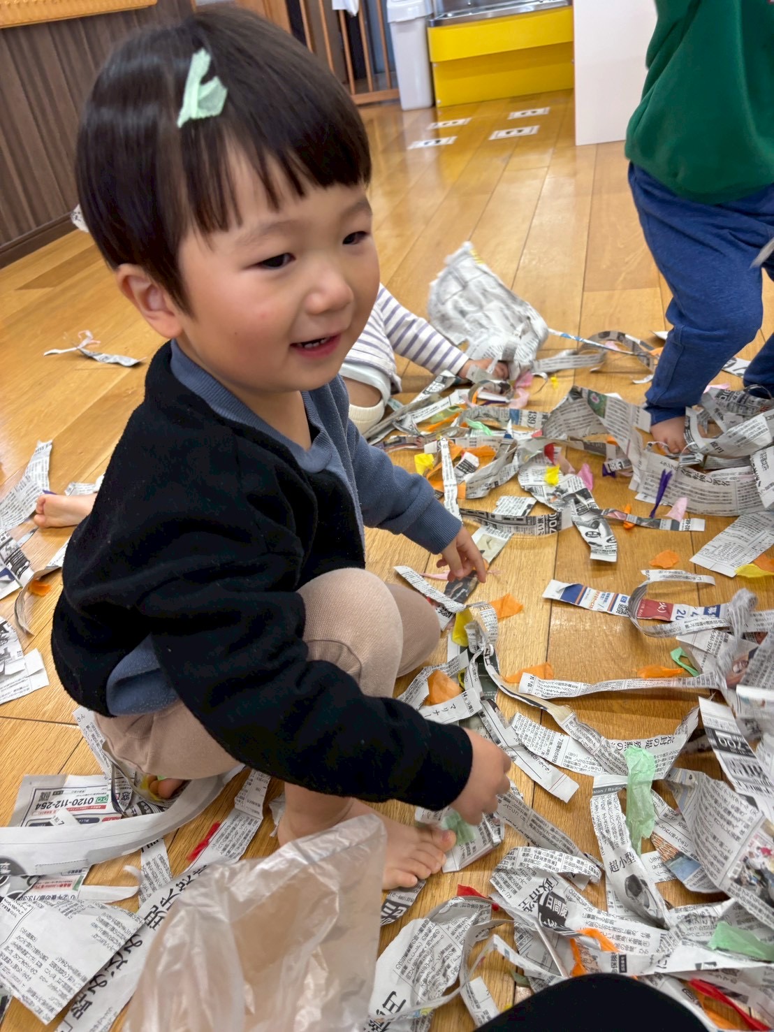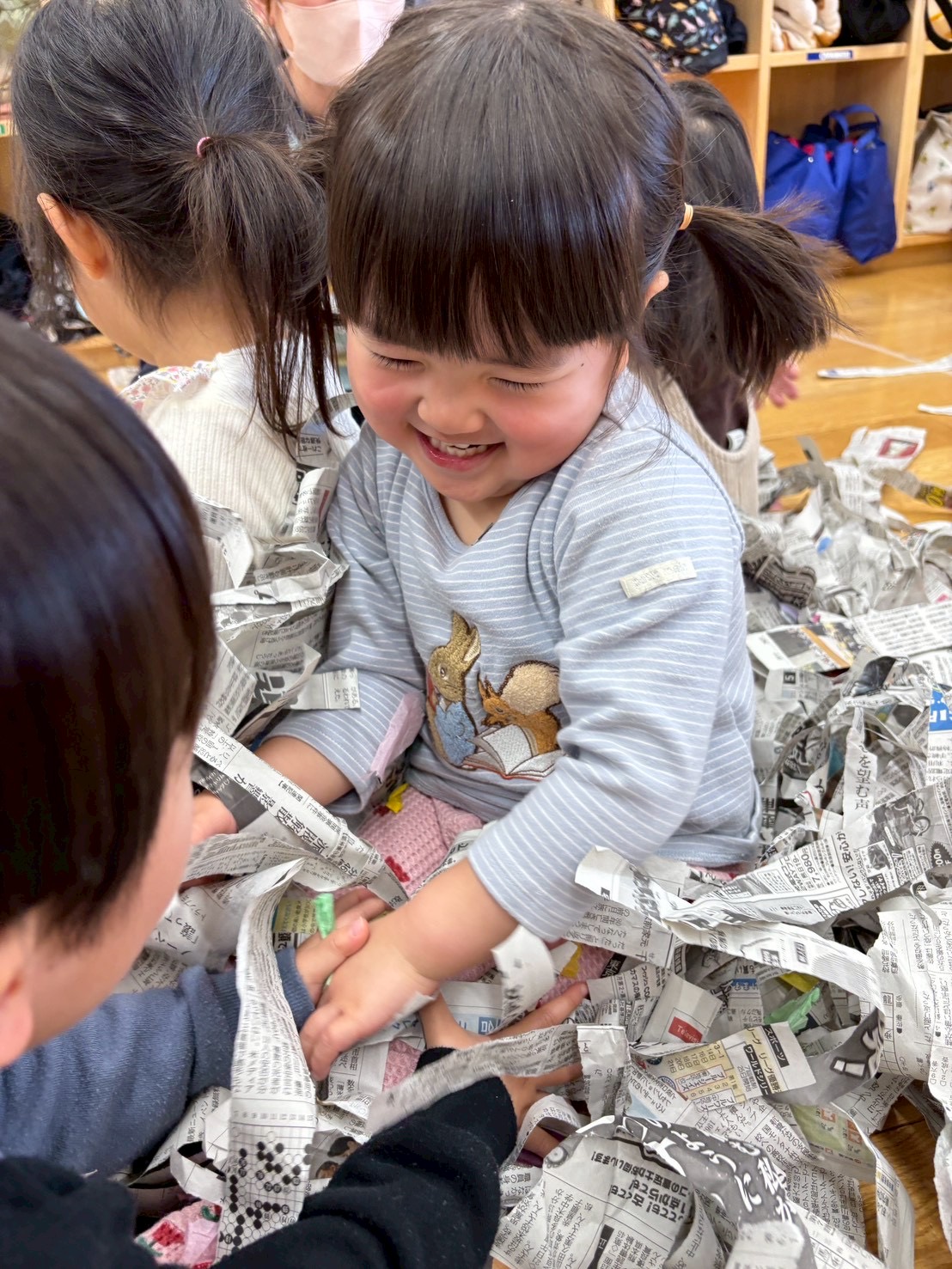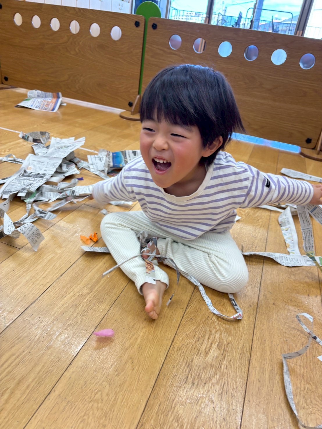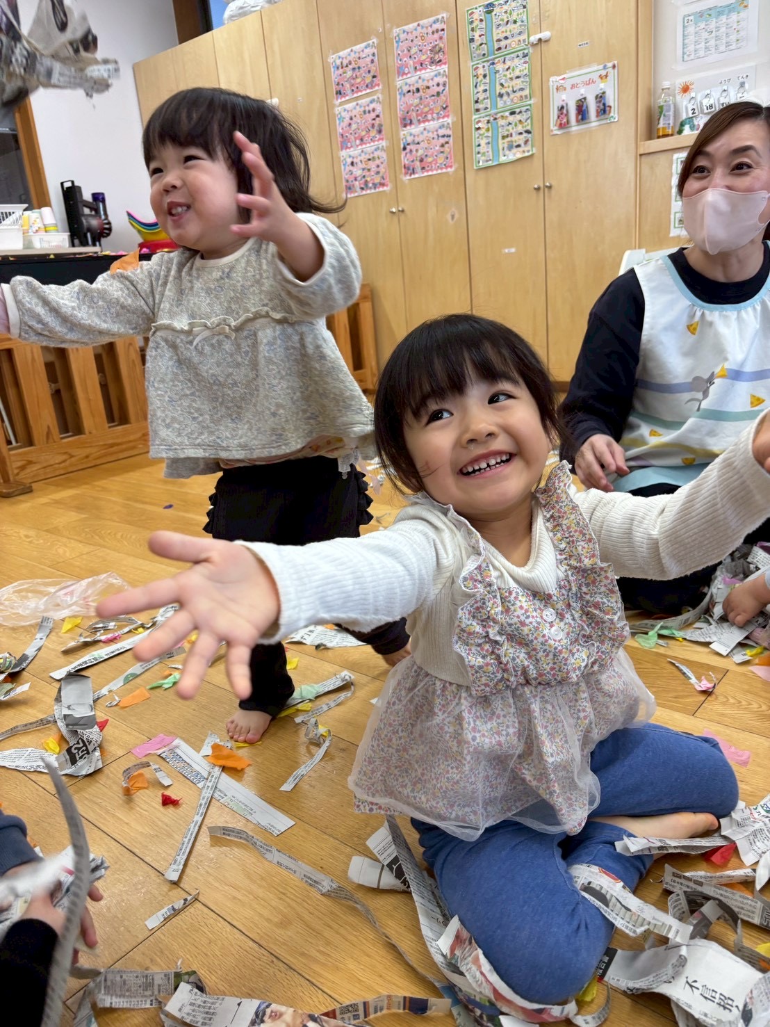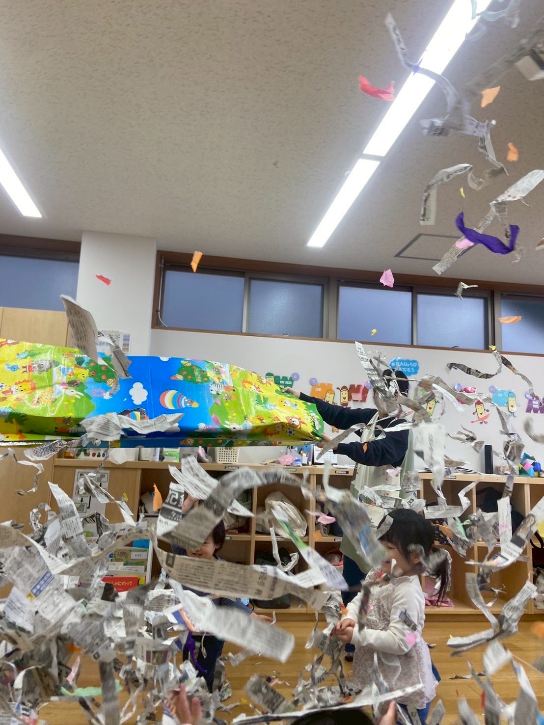 2026.02.18 新聞シャワー📰🌸 新聞遊び始めるよ🗞️✨ ビリビリ破って、集めてポイっ✨ ビリビリ〜❗️ヤー✨✨😆 ビリビリそれ〜✨✨❗️ 保育士たちも子どもたちに新聞シャワーをかけます! それーー✨✨✨✨‼️ 捕まえろ〜😊📰 新聞シャワーに囲まれてみんなでニコニコ楽しかったね😊✨ またあそぼうね☺️