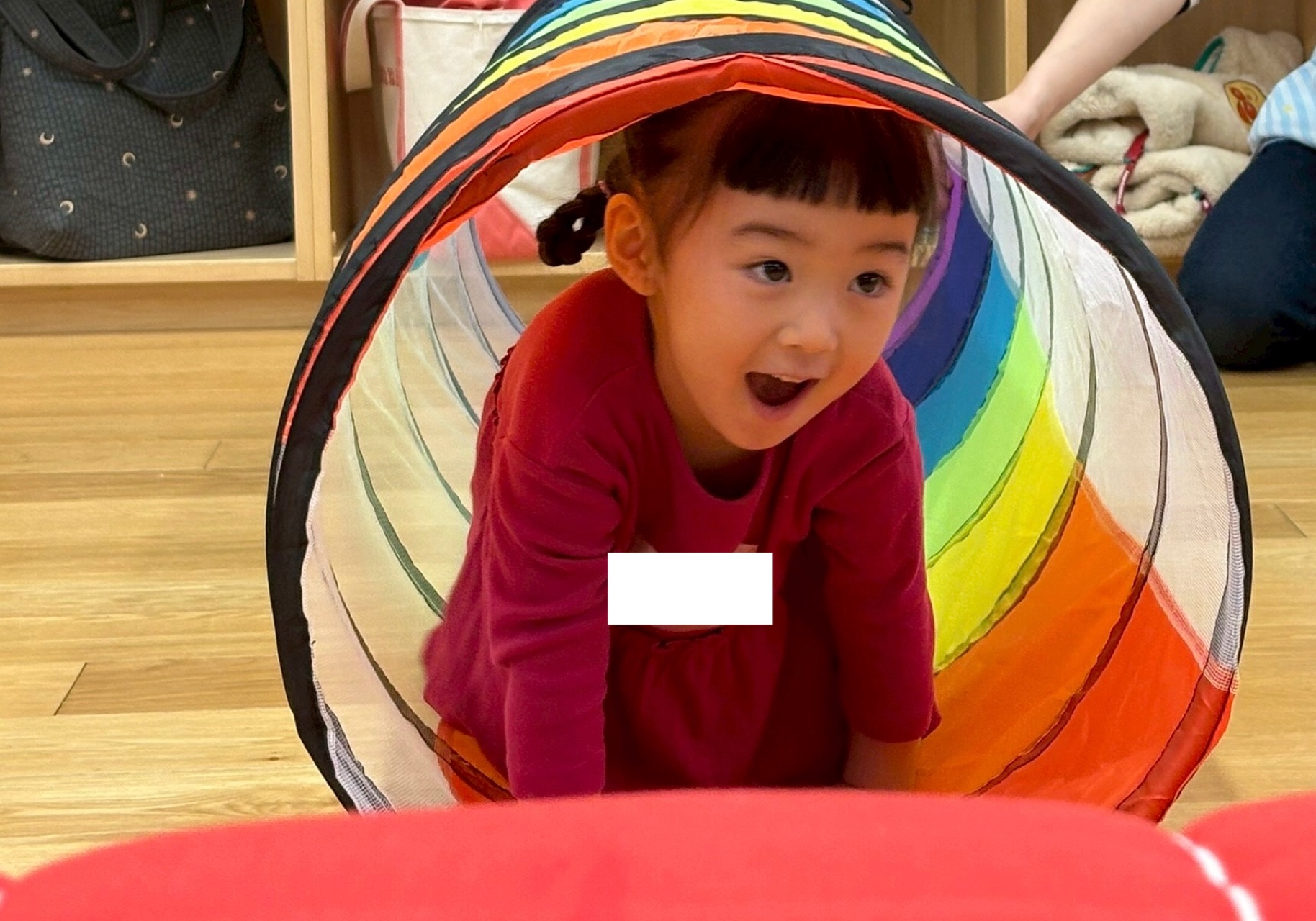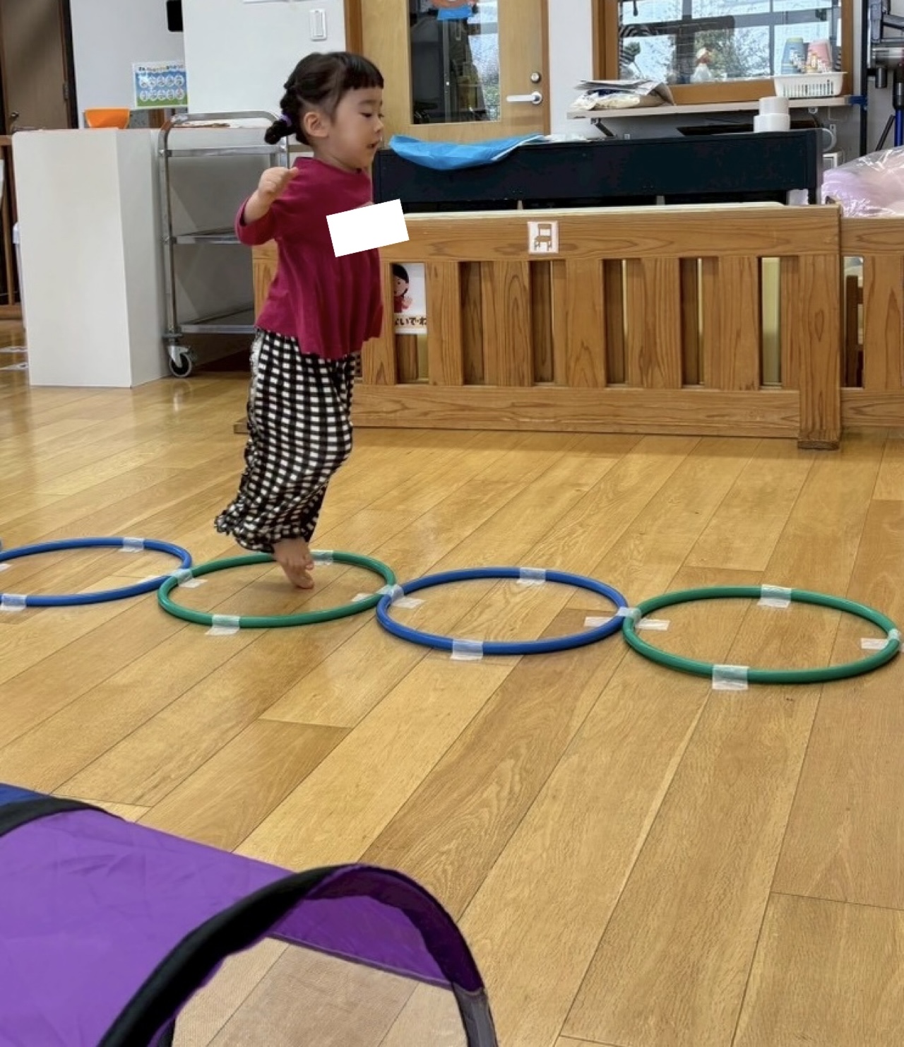 ストレッチやダンスをして体を温めてほぐした後は、平均台やフラフープ、トンネル、マットを使い、サーキットをしました!